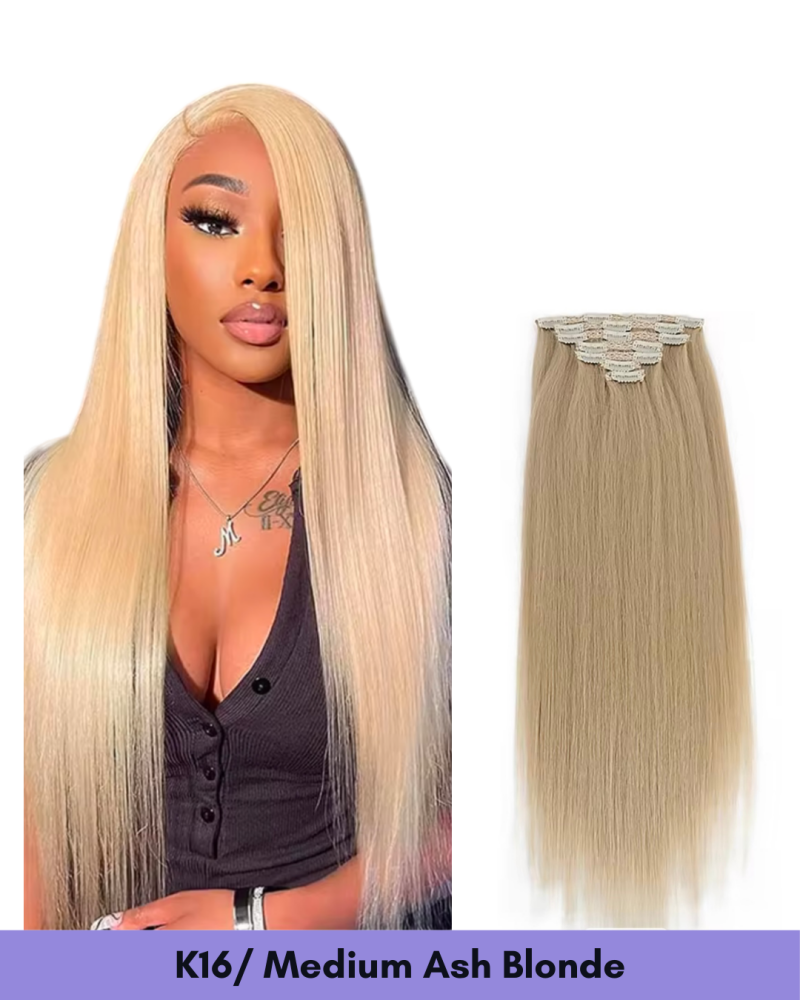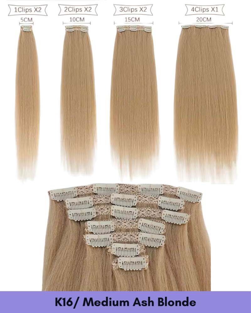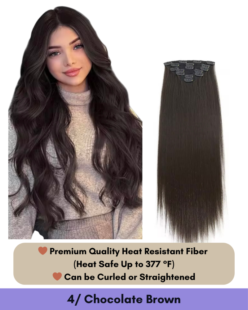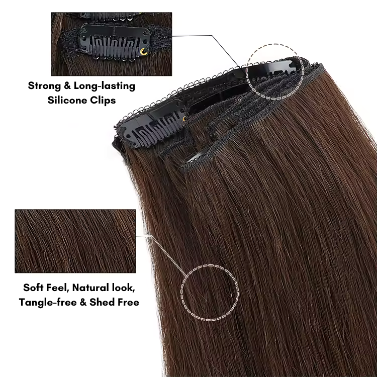 Emu Flair Aloe Clip-In Extensions are the perfect way to quickly and easily switch your look and provide a soft feel, natural look and lightweight volume. They are hand-made with a flexible, stitched band to provide great volume at the root. The strong and long-lasting silicone clips make them safe and perfect for daily use. They are very versatile and can be worn on their own or can also be combined with our Kora drawstring ponytails to create a beautiful half up-half down look. One pack is enough to fit the full head!